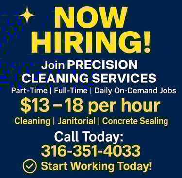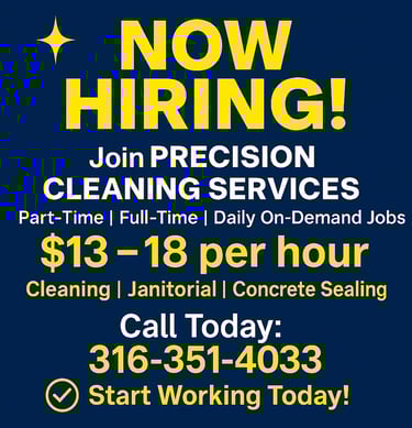Precision Cleaning Service LLC is your trusted partner for high-performance janitorial solutions across Wichita, Derby, Andover, Newton, Hutchinson, El Dorado, and the broader South Central Kansas region.